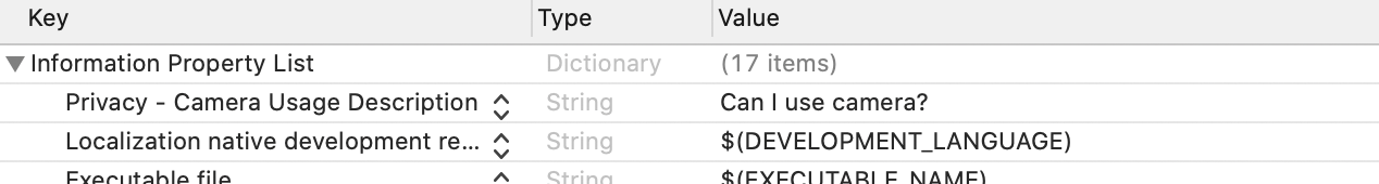 - In the Info.plist file, you must Set Camera Usage permission. Next to the top line Information Property List, click the + to add an item. Find Privacy - Camera Usage Description. You must also provide a Description in the value field which will be included in the message on the app that asks the user to grant permission to use the camera.
