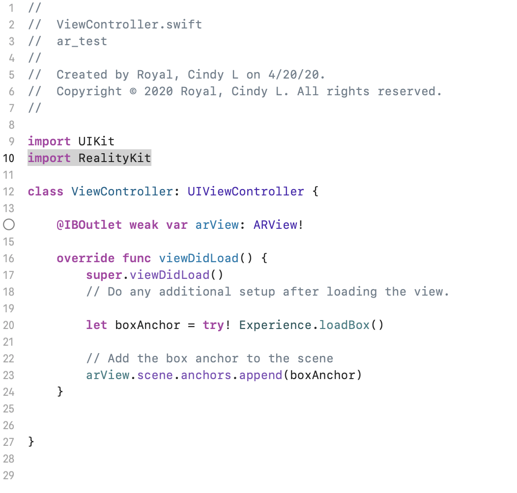 - Include the code in the box in ViewController.swift file. There are just a few lines that import Reality Kit and reference the Experience project and the arView
