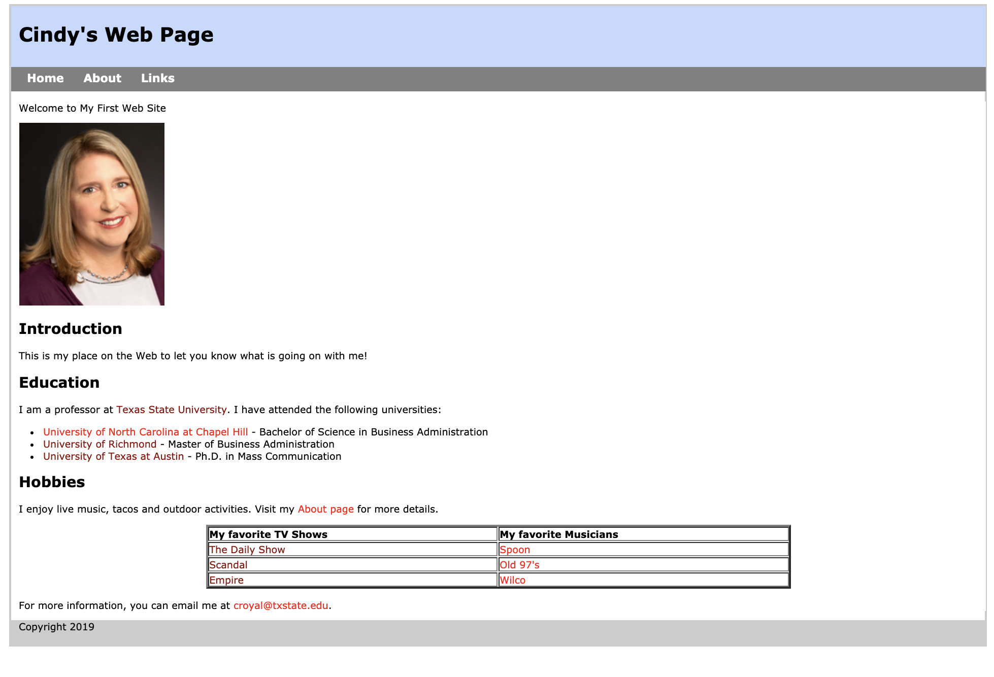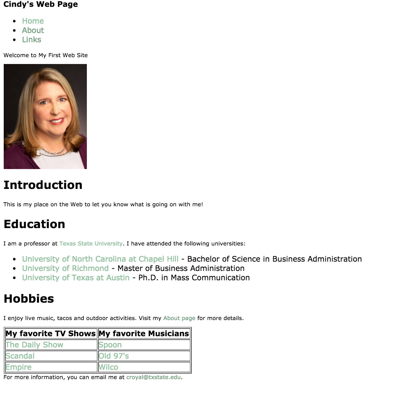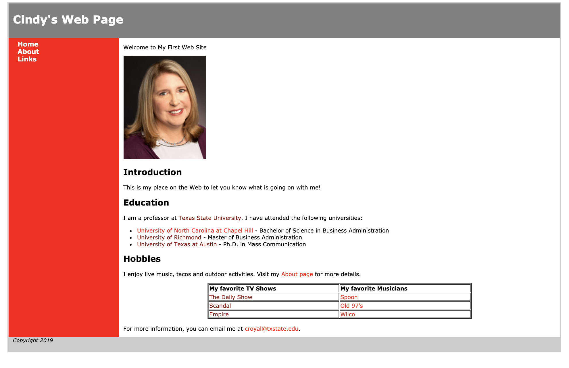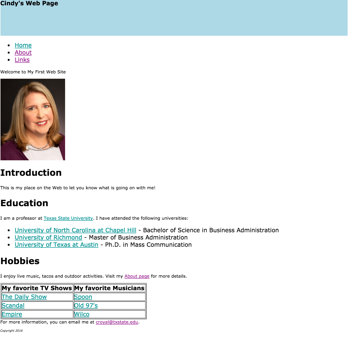 In the index.html page, insert the Sample Code - HTML into the head of your document. You will need to do this in all your html pages for the styles to apply to those pages. Open index.html that you created in a browser (File, Open File). You should see the file render with the new styles associated. .