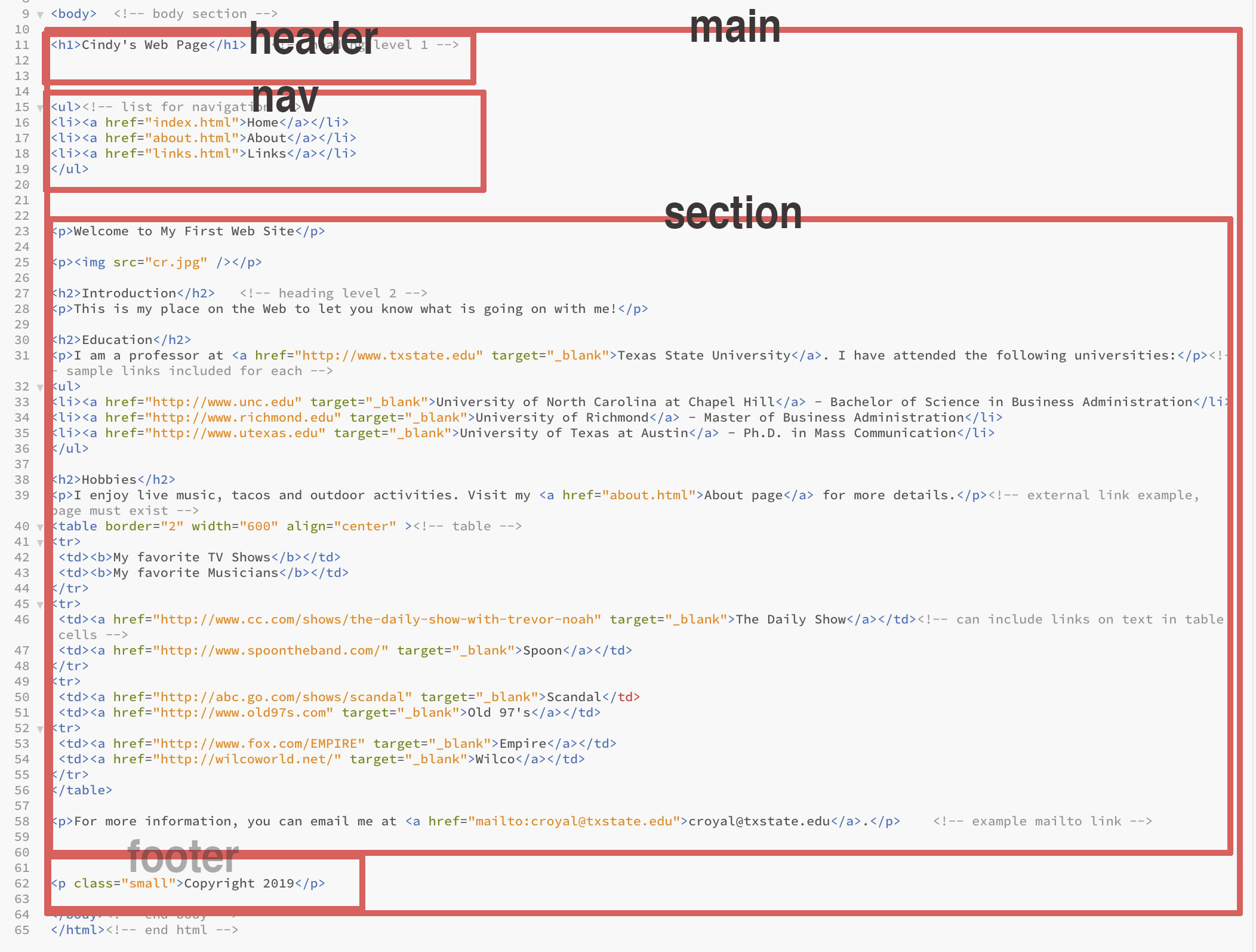 You will make some changes in your html page to apply the divs you will need to begin to add structure. We'll apply ids for header, nav (for the navigation bar), section (for the content and footer. Making a "main" div that contains all the content on the page, with a margin "auto", centers the page in the window. We use percent widths for our divs to begin applying techniques that allow the site to be responsive to different sized devices.The image below shows the plan for creating the divs to create the site layout grid.