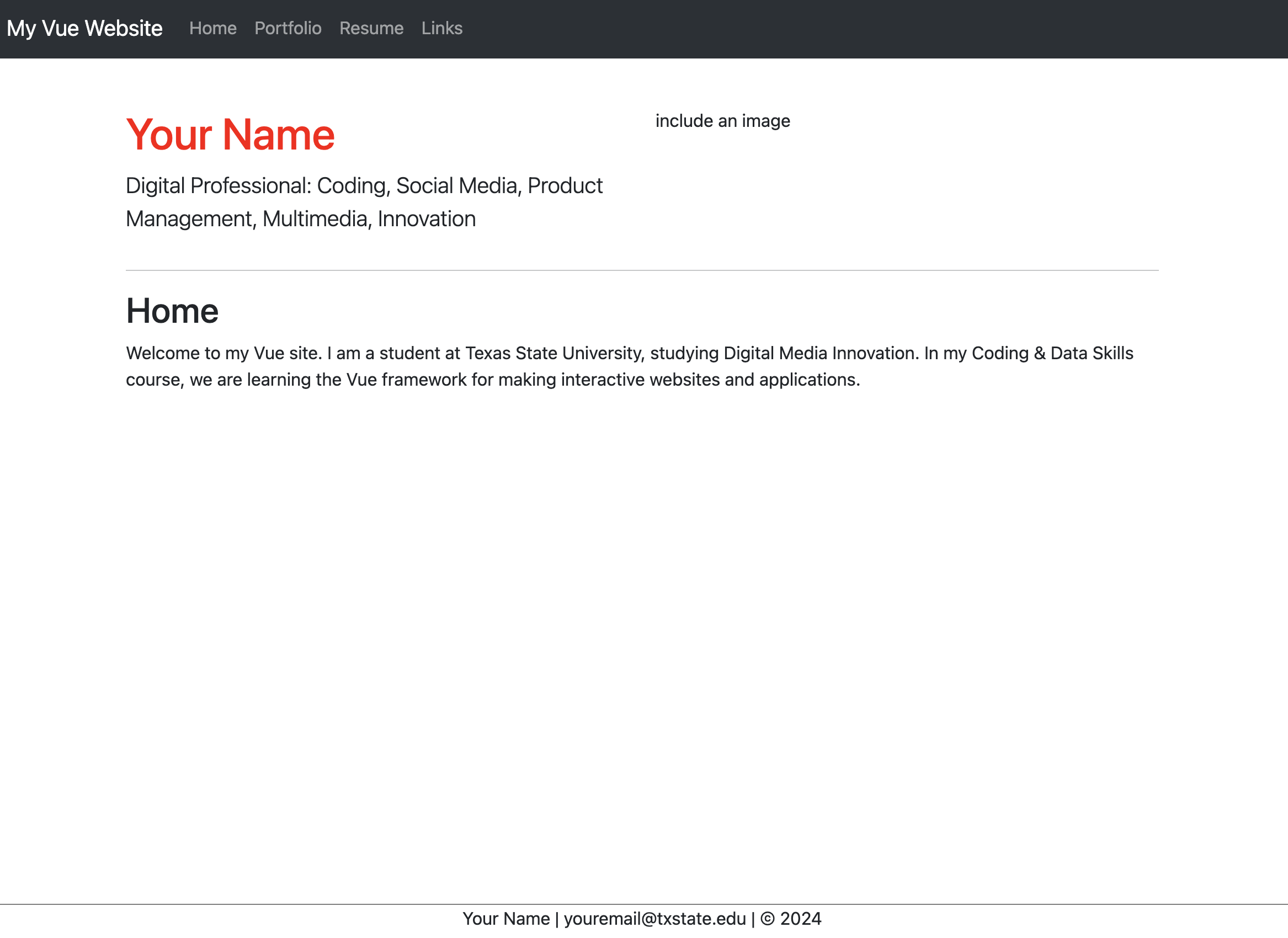 We can use Vue features to create an entire interactive website template that prevents us from having to recreate parts of the site on every page. Content will be served in JS components. For example, maybe we want to use a template for the top heading, navigation and footer and serve the content into that template depending on what is selected. For this simple example, we will continue to use the Vue3 cdn link and create sample content for each of the site's sections on one html page. However, a more complex app would need to be created using a Node.js installation and hosted on a server that supported serving separate .js files. But this example will give you an idea of how this works.
