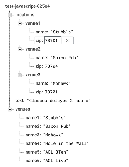 Let's say you have even more complex data, in this case, a listing of venues along with their zip codes. You could imagine having all kinds of data associated with an individual venue, like address, phone, genre, other descriptions, etc. Like the previous dataset, each item has a unique main key, but it has both name and zip for each venue. This example gets a "snapshot" of the data of each child of the location node and then gets the "name" and "zip" value of each location. This example formats the data into a table with name and zipcode.