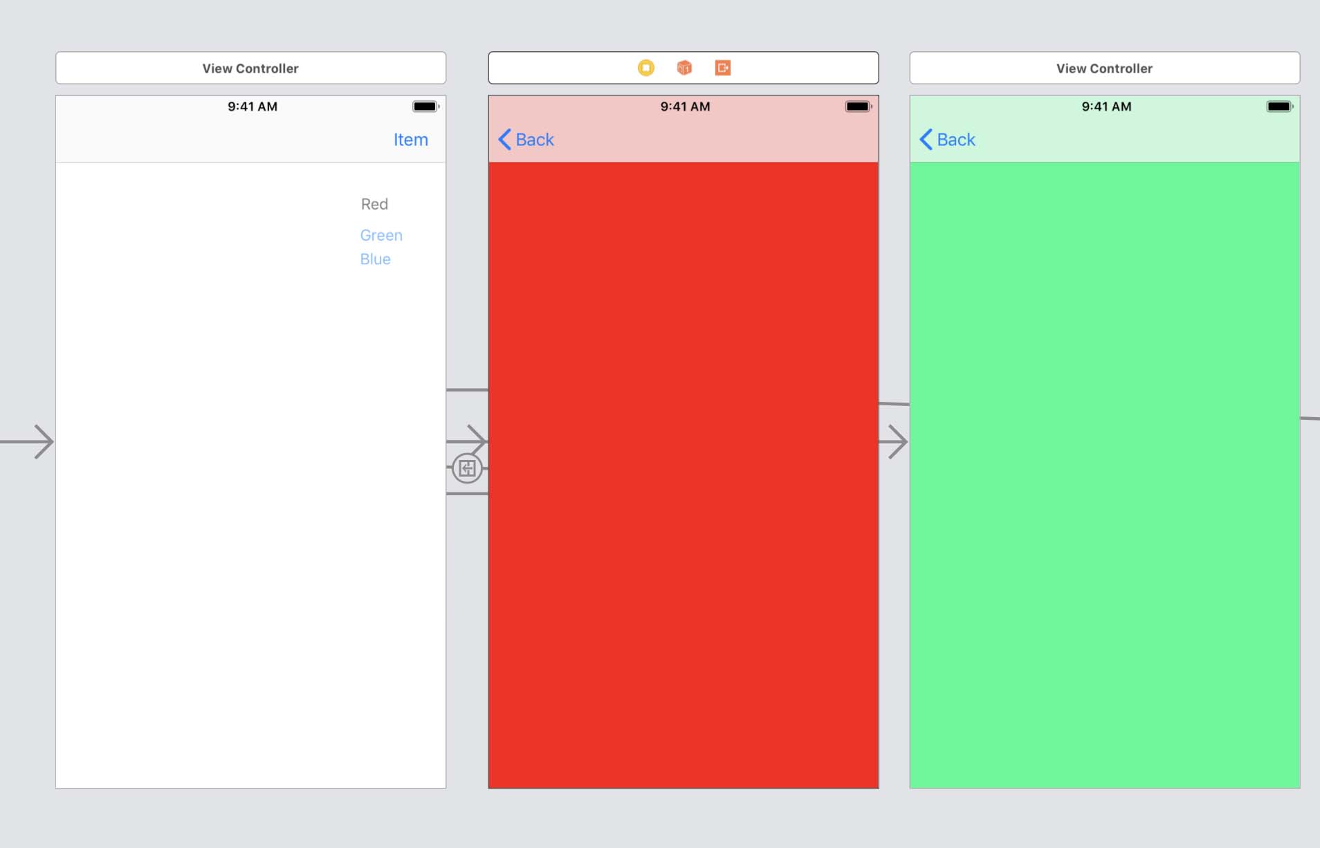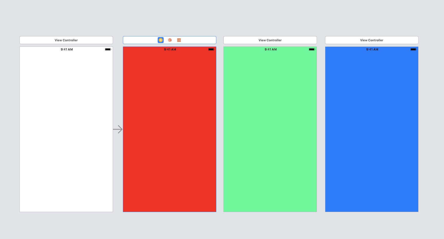 First, we are going to create new View Controllers, one for each color. Search for a View Controller in the Library and drag three to the Storyboard, placing them next to each other in the Storyboard. The bar above each view lets you move each around. The initial Storyboard that came with the project will be used later.
