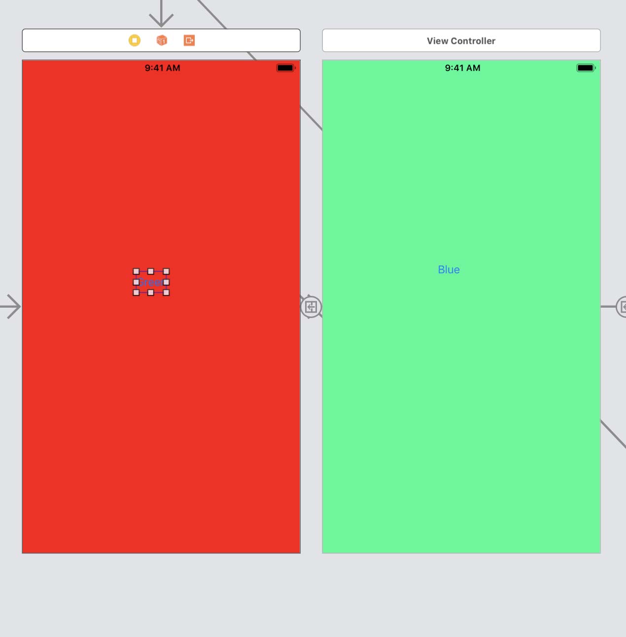 We need to make our Red scene the initial scene for now. If you run the app now, it will start at the original View Controller, which is still white. Click at the top of that scene on the icon that is the View Controller (yellow circle with square in it). In the Inspector under title, check Is Initial View Controller. You can also move the arrow that is pointing to the original View Controller and move it to the Red View Controller. Now when you test the app, it should start in the Red scene.